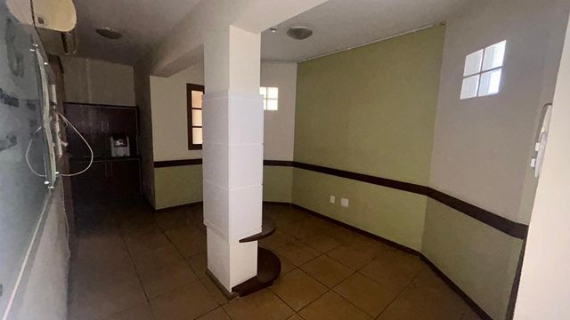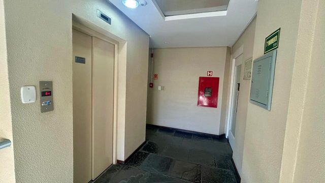 Ampla sala central. Edifício com portaria e elevador.